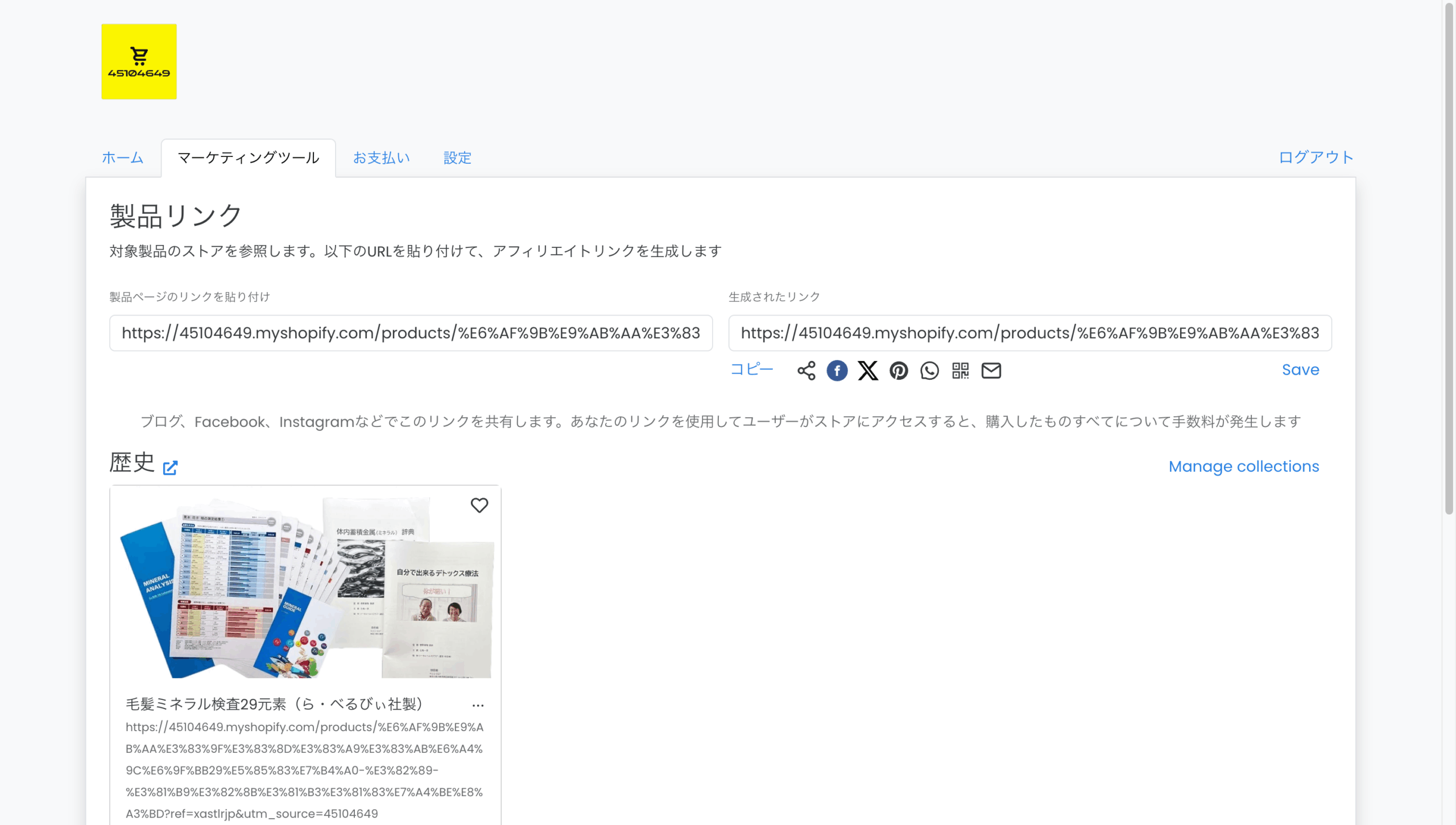 こちらのページに訪れると、過去に作ったアフィリエイトリンクが一覧になって表示されます。