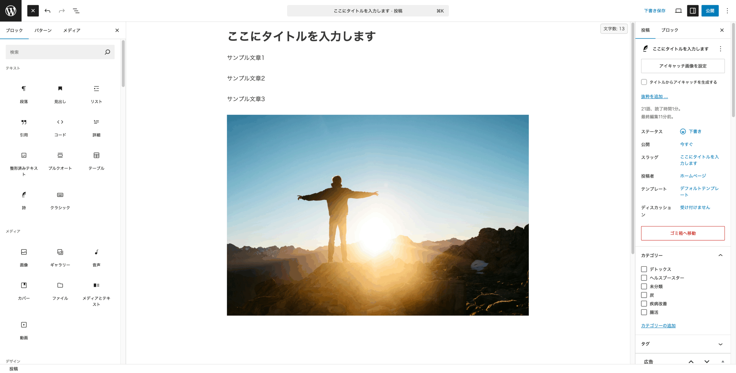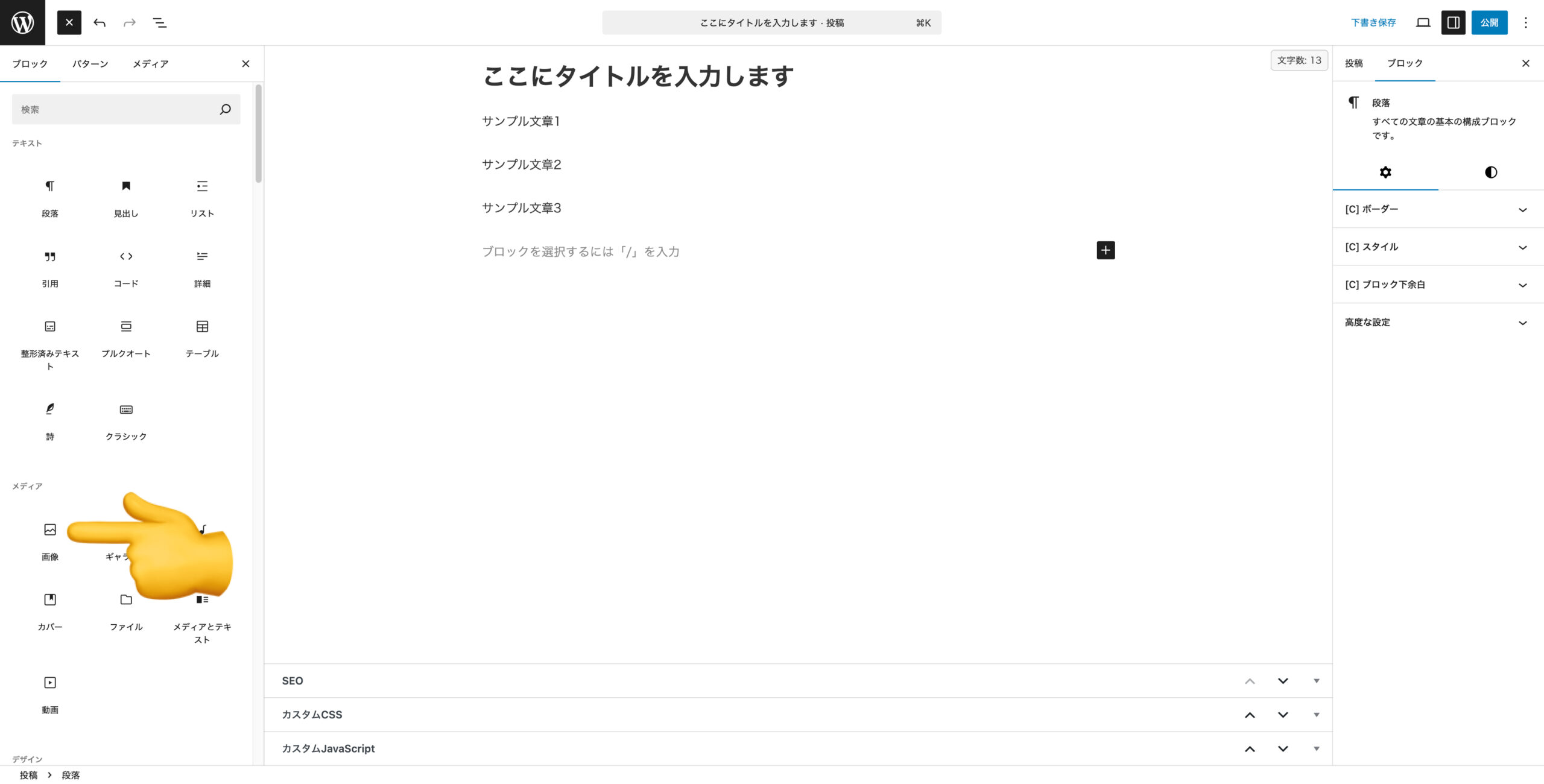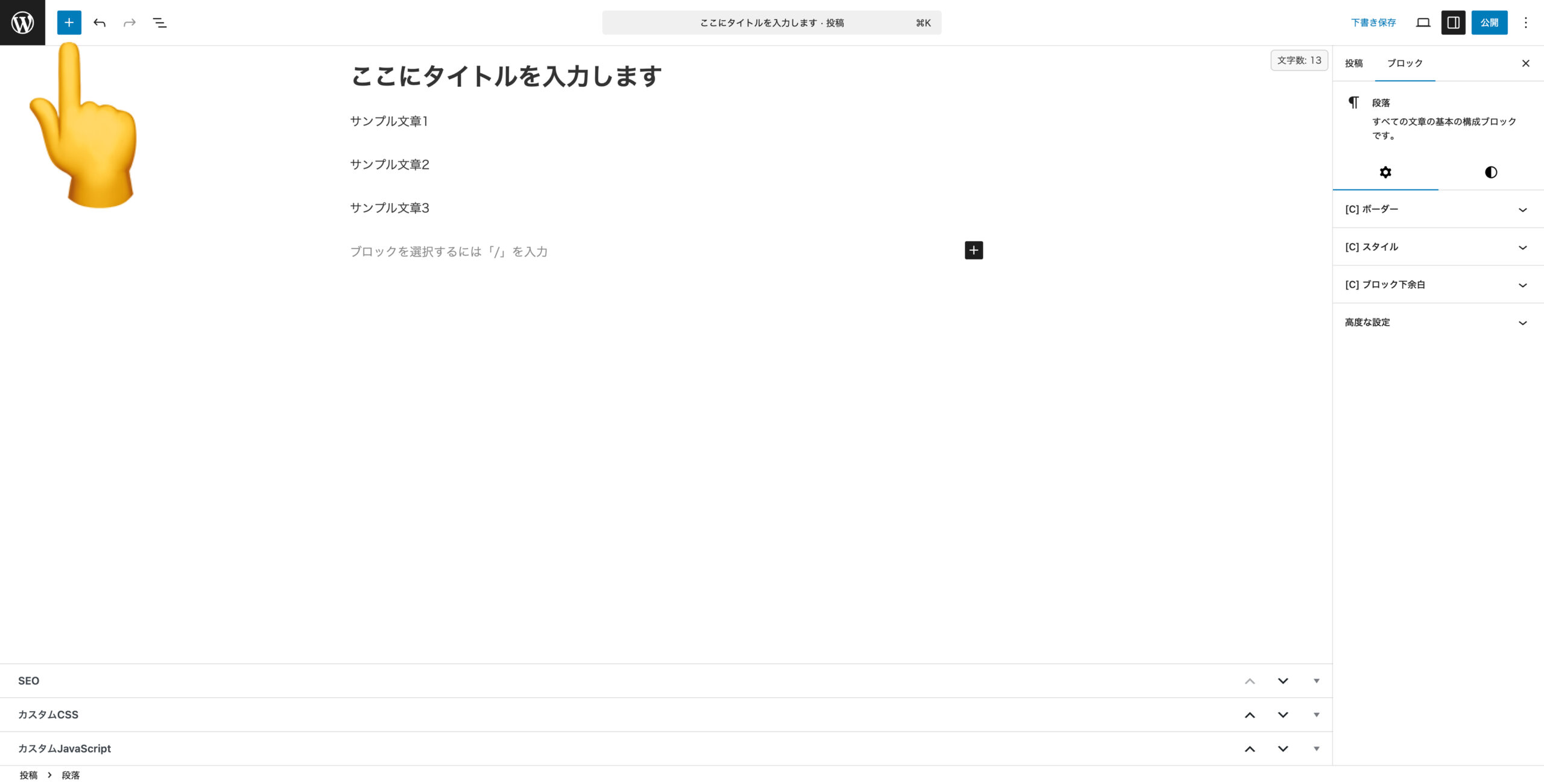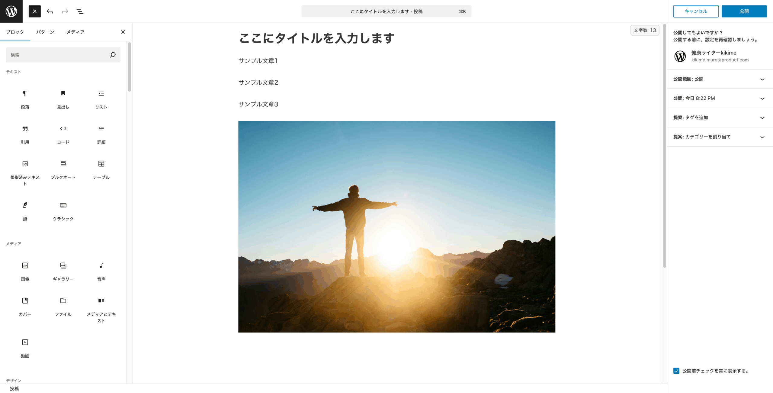 そして、「ブロックを選択するには「/」を入力」という部分に記事の内容を書いていくことになります。