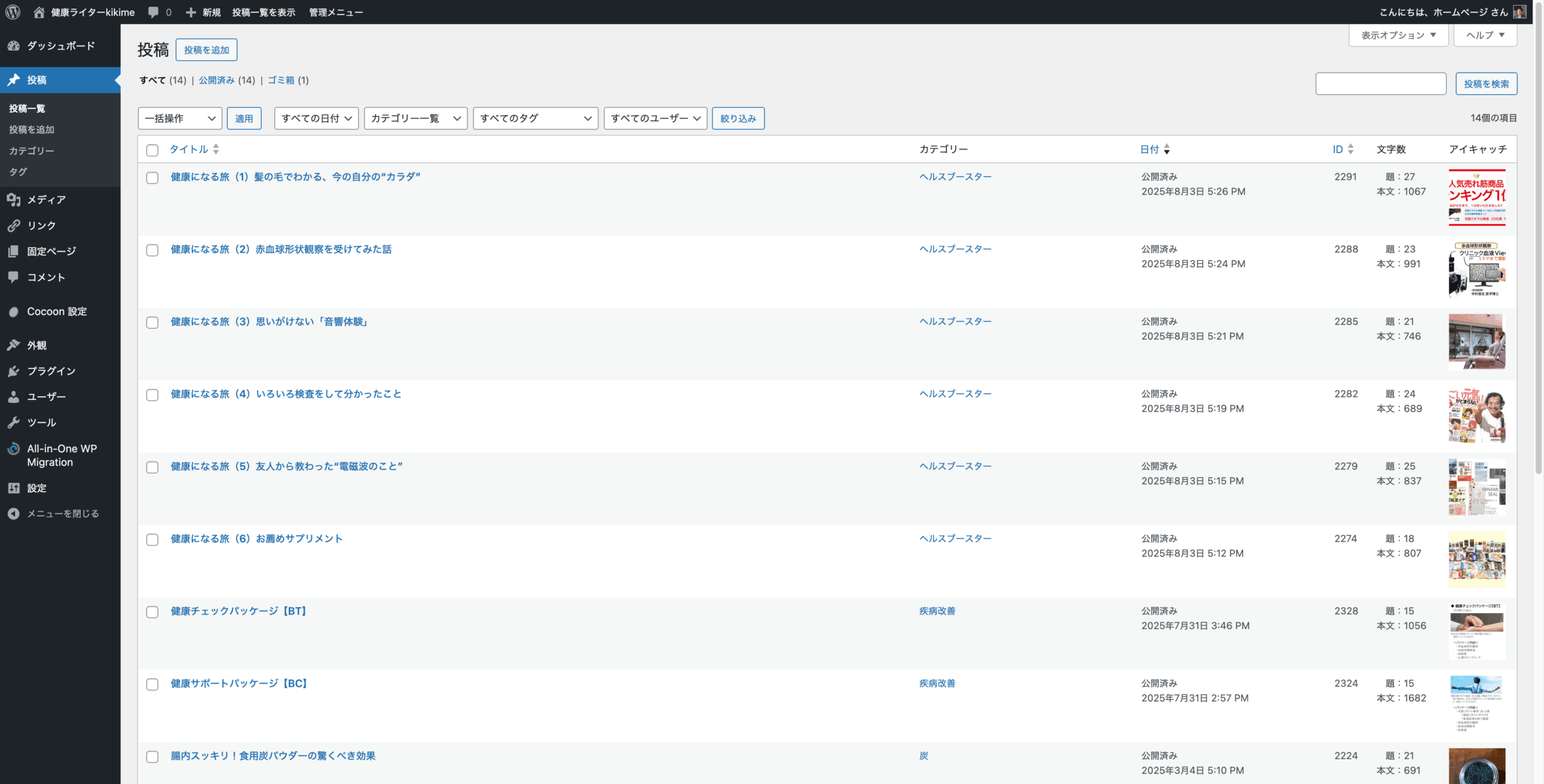 投稿をクリックすると、上記のように過去に書いたブログ記事が一覧になって表示されます。
