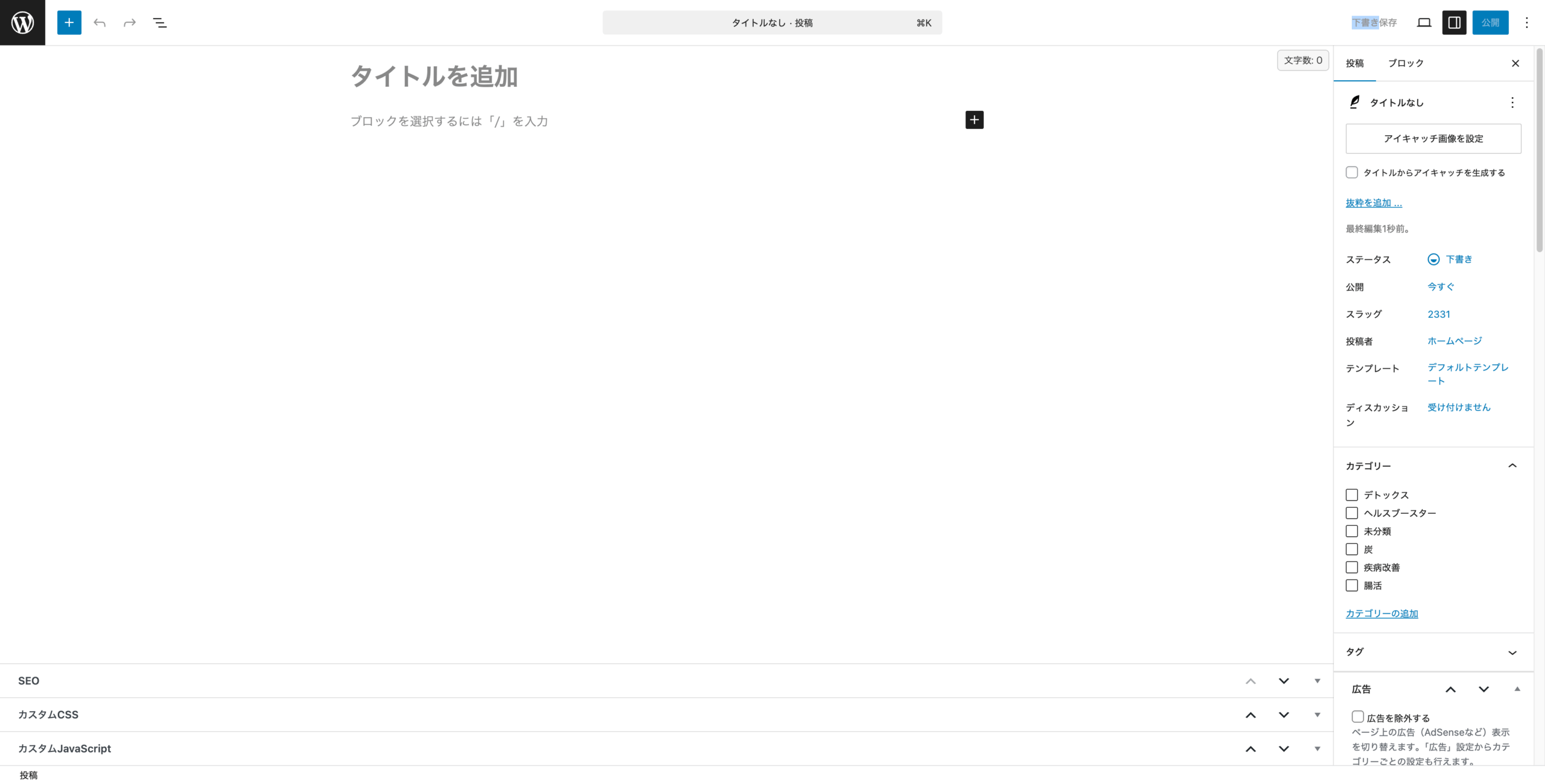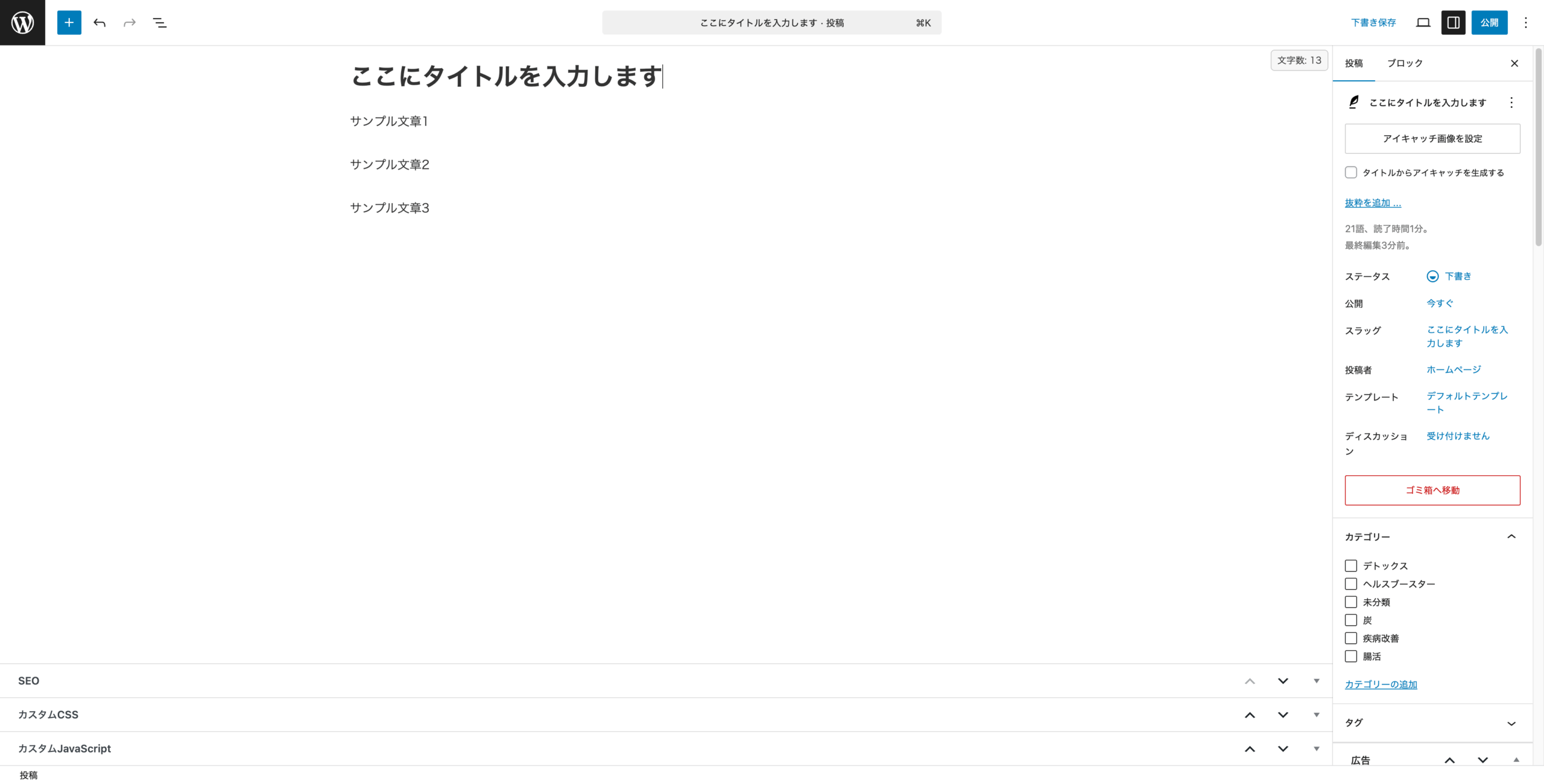 「タイトルを追加」という部分をクリックして、記事のタイトルを入力します。