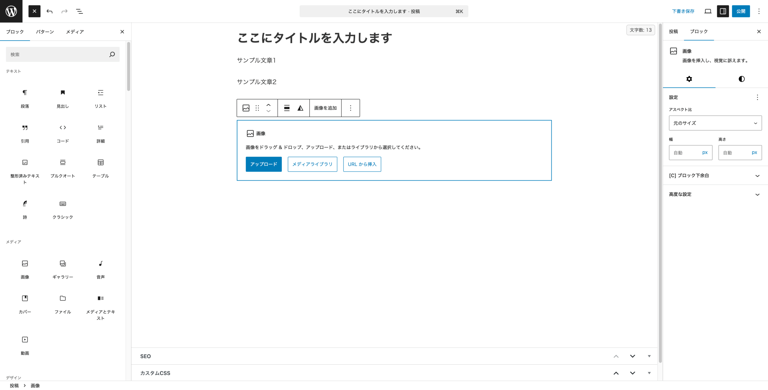 追加された画像ブロックの「アップロード」をクリックして、パソコン内の画像を入れてみましょう。